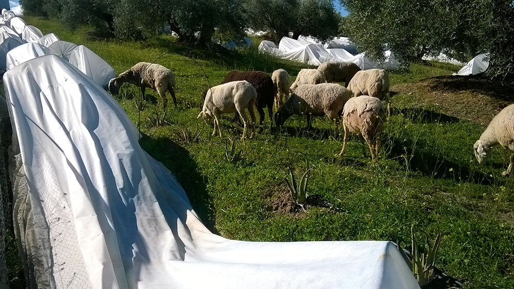 - A partir de Febrero o Marzo, introduce ganado ovino para controlar la hierba, sobre todo la que crece entre las plantas de Aloe Vera. Las ovejas se comen la hierba inapropiada sin tocar el aloe vera que no tiene un sabor apetitoso para ellas. Además de pastorear, el ganado también va enriqueciendo el suelo con su estiércol (uno de los mejores abonos posibles a largo plazo) haciendo así una doble función de la forma más económica y natural.